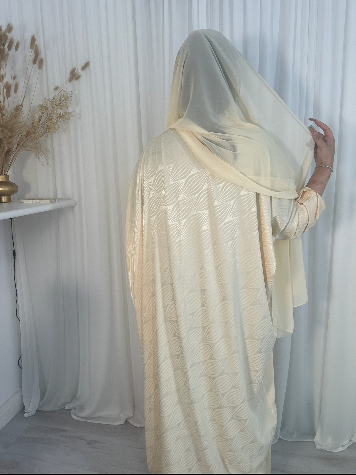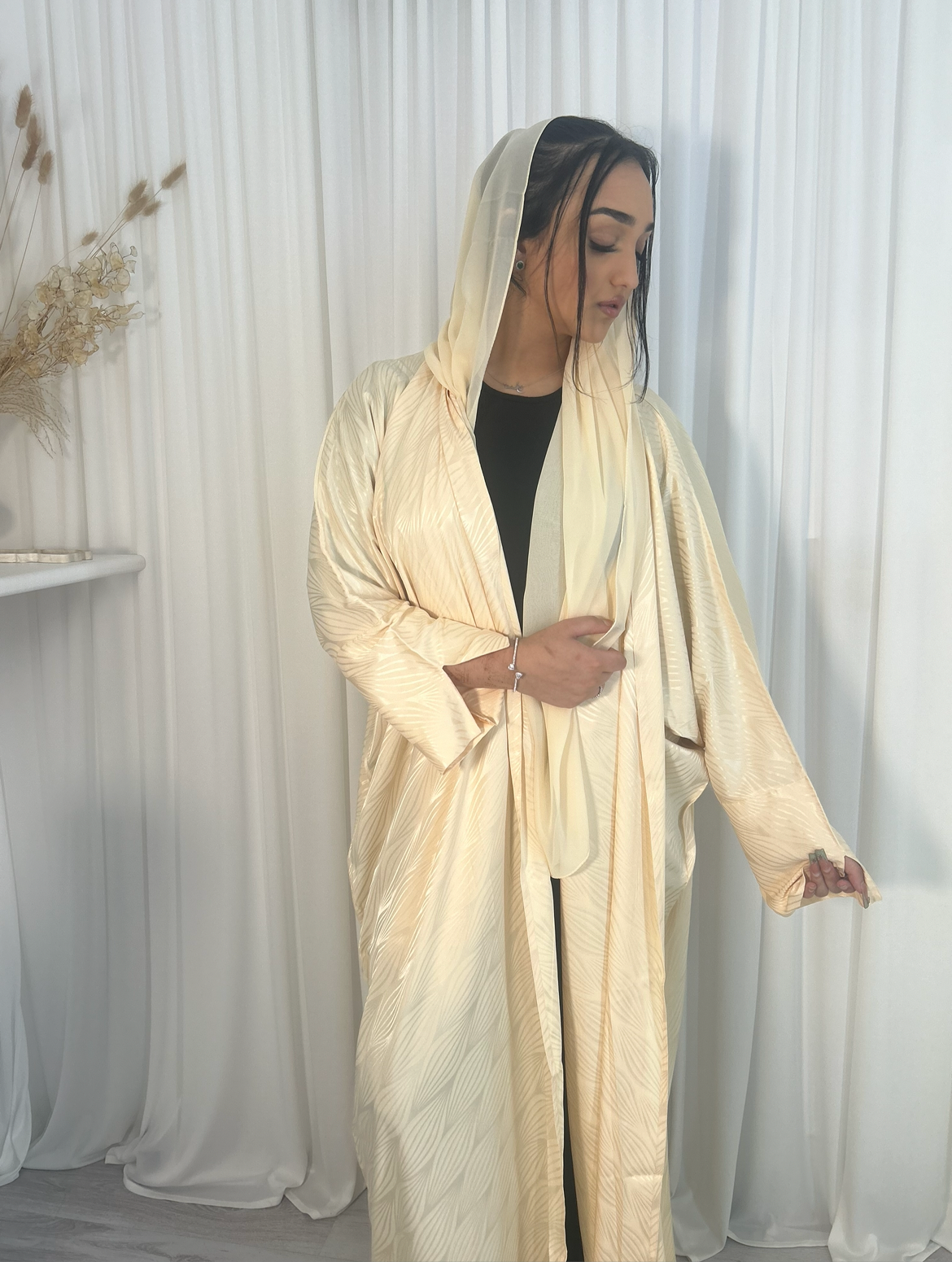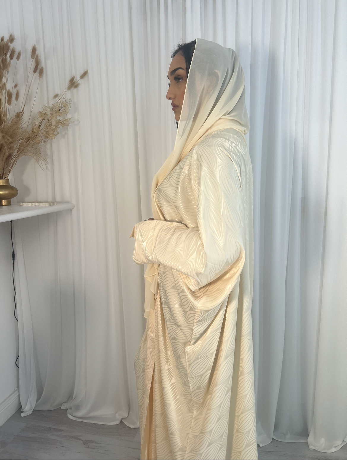 Elevate your wardrobe with the DESERT GLOW Open Abaya. This luxurious silk piece, handmade in the UAE, features a stunning gold tone that catches and reflects light, adding an elegant touch to any outfit. Available in sizes 52, 54, 56, and 58, this abaya is the perfect statement piece for any occasion.