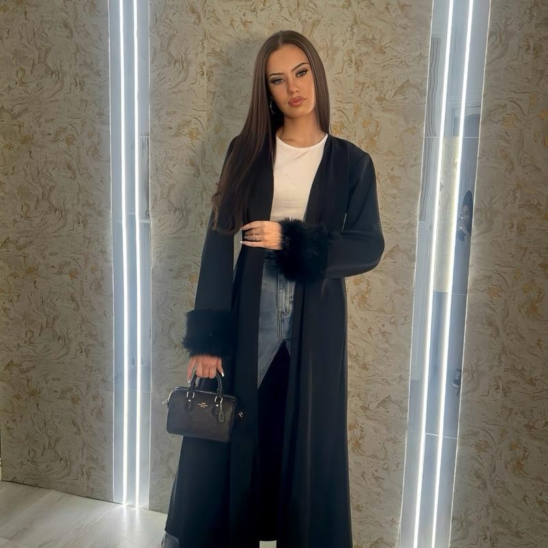 The fur sleeve design adds a stylish and fashionable touch to the jacket, making it a versatile piece that can be worn on top of abayas or outfits. The high-quality material ensures that the jacket is durable and long-lasting, making it a great investment for your winter wardrobe.