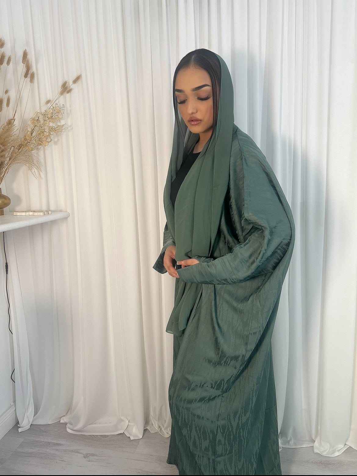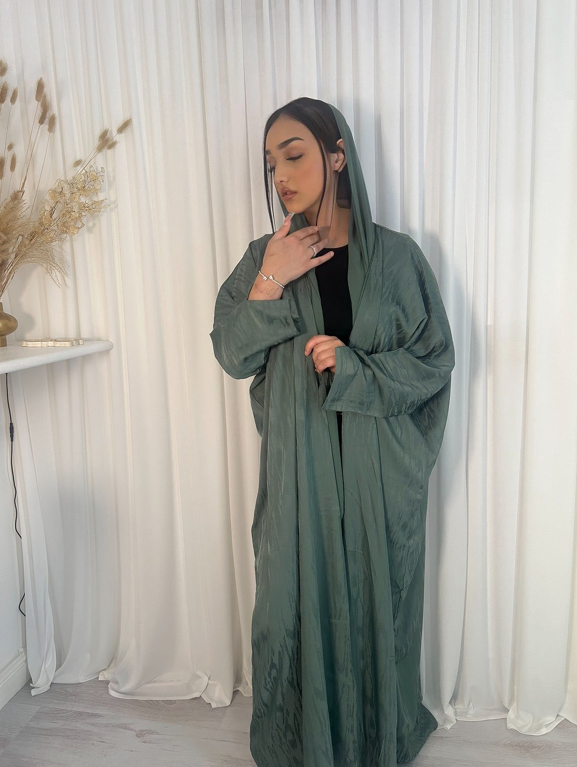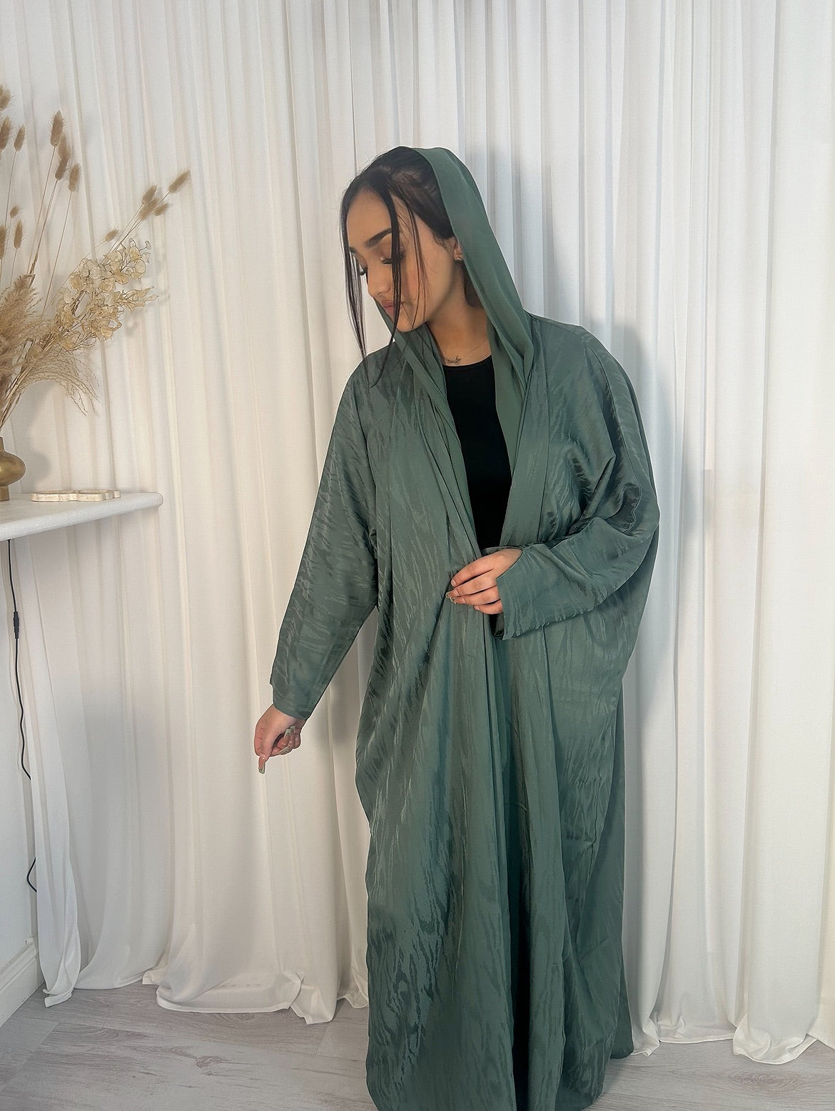 Indulge in luxury with our FOREST JEWEL Open Abaya. Handmade in UAE, this opulent silk abaya features a stunning emerald green tone. The lightweight and breathable fabric exudes elegance and sophistication, making you feel like a million bucks. Available in sizes 52,54,56 & 58. Elevate your wardrobe with this exquisite piece ✨