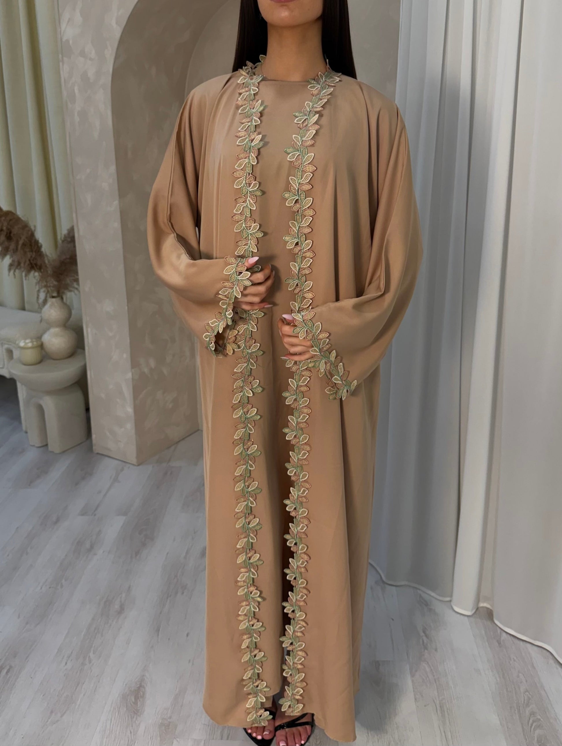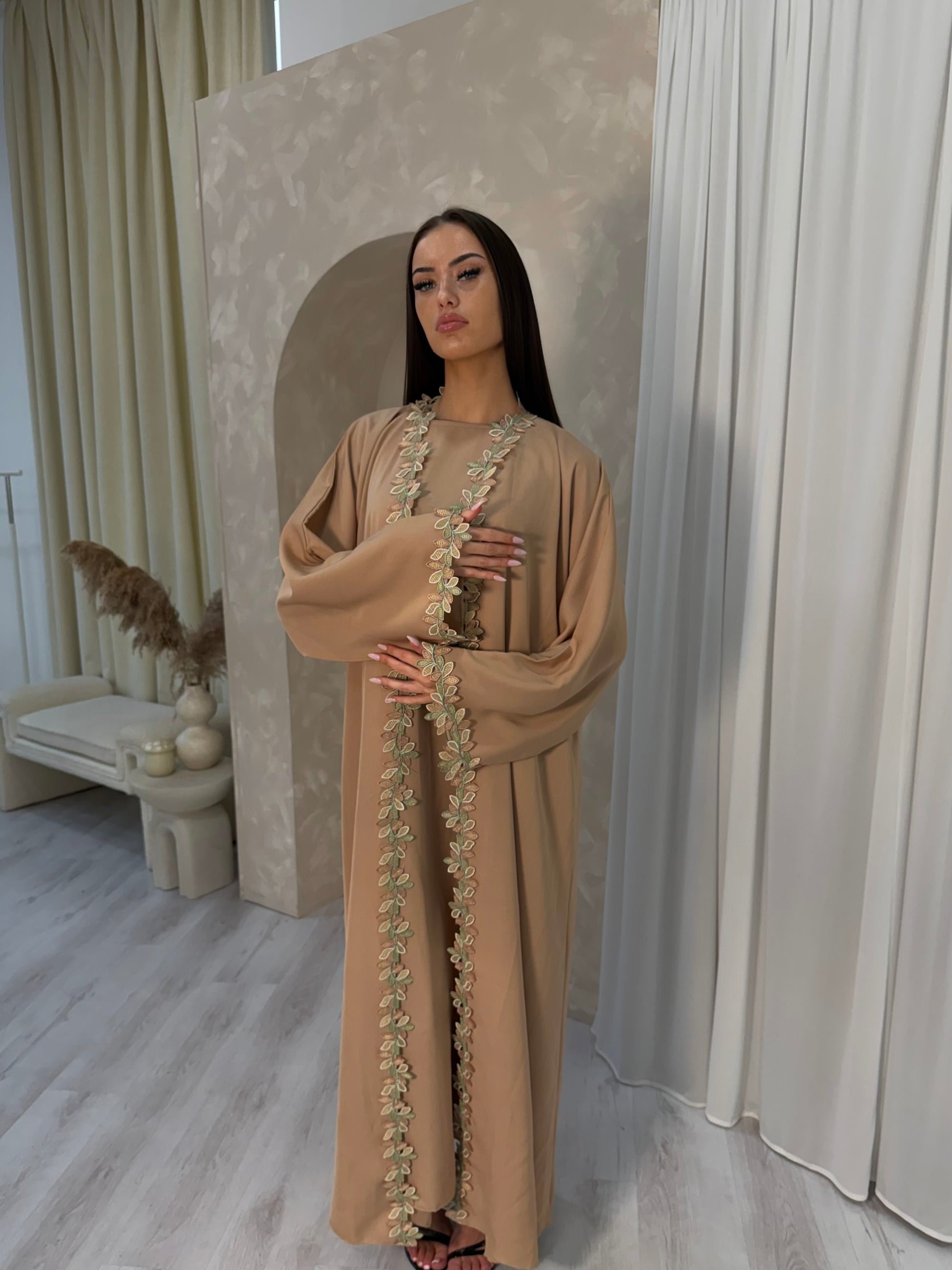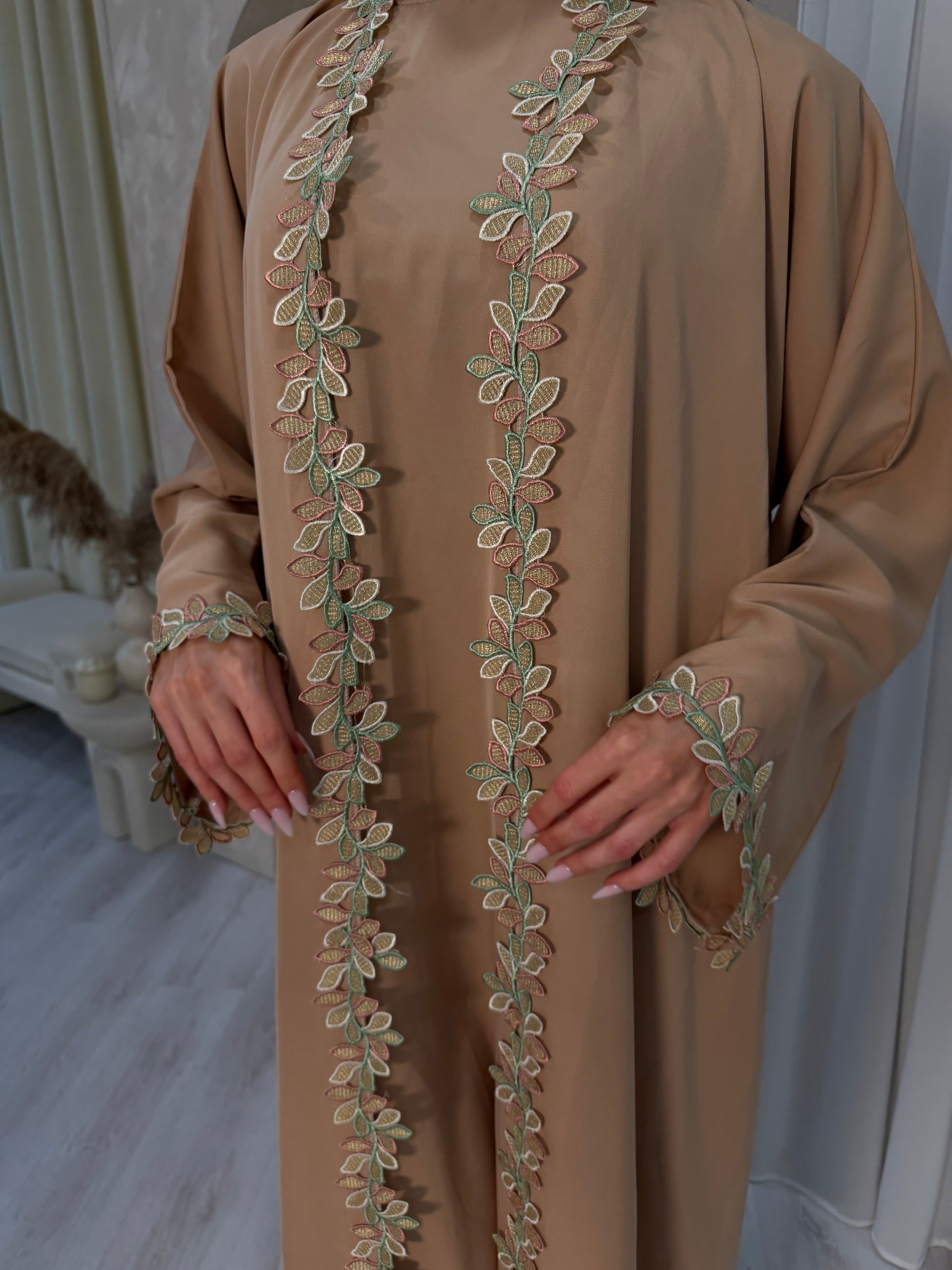 The abaya is beautifully adorned with intricate hand-sewn leaf embellishments running along the front and cuffs, adding a subtle yet luxurious statement. Featuring flared sleeves with detailed finishing and front buttons for versatile styling, the Inara Abaya balances sophistication with everyday comfort.