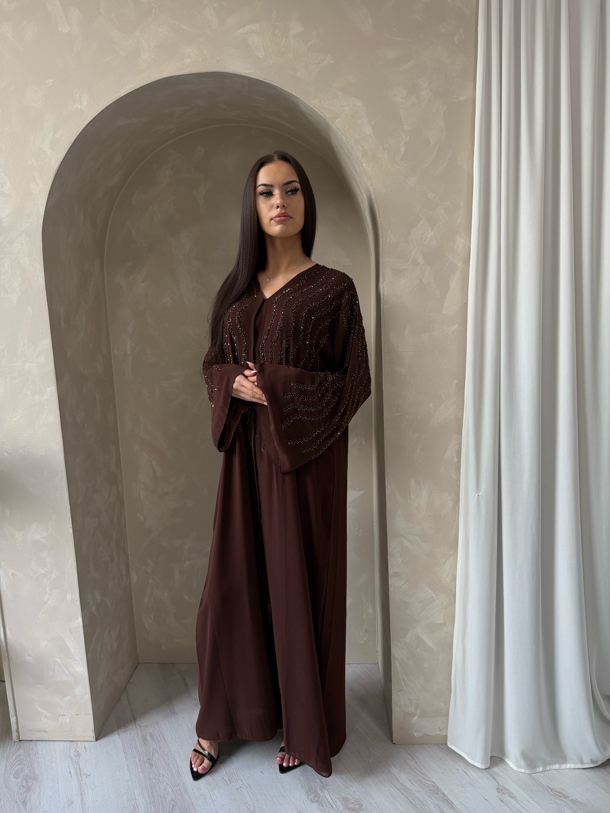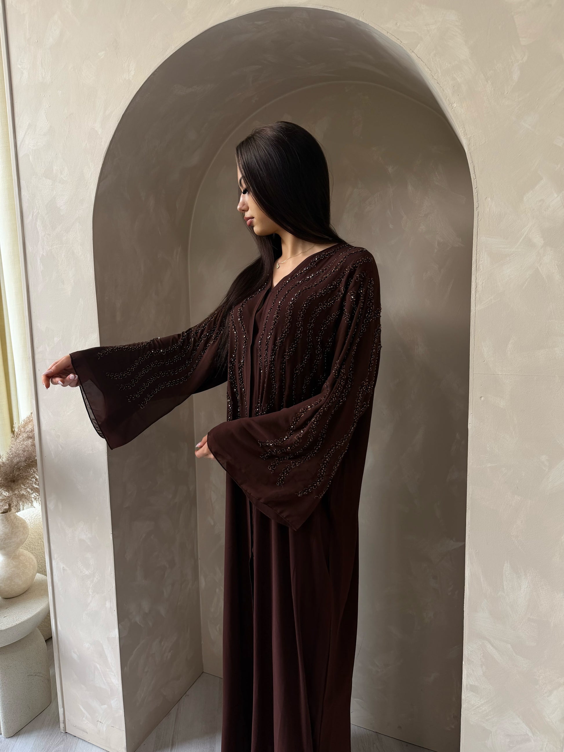 Elevate your wardrobe with this stunning Layali chiffon abaya in Brown, a perfect blend of elegance and modern design. The abaya features a lightweight, flowy chiffon overlay that drapes gracefully, making it ideal for both casual outings and special occasions. The abaya is andorned with handsewn bead design, adding a sophisticated texture that enhances the overall look.