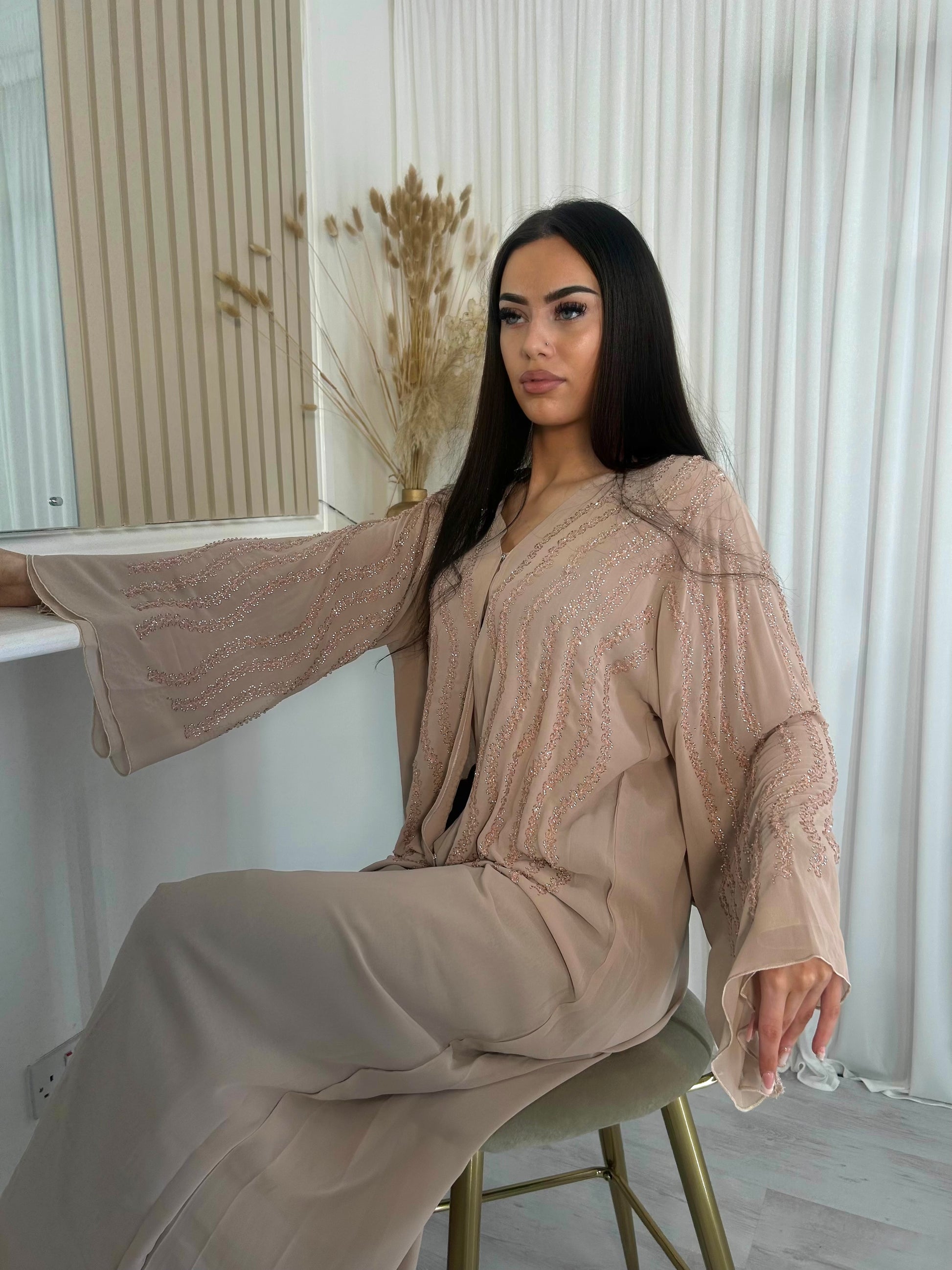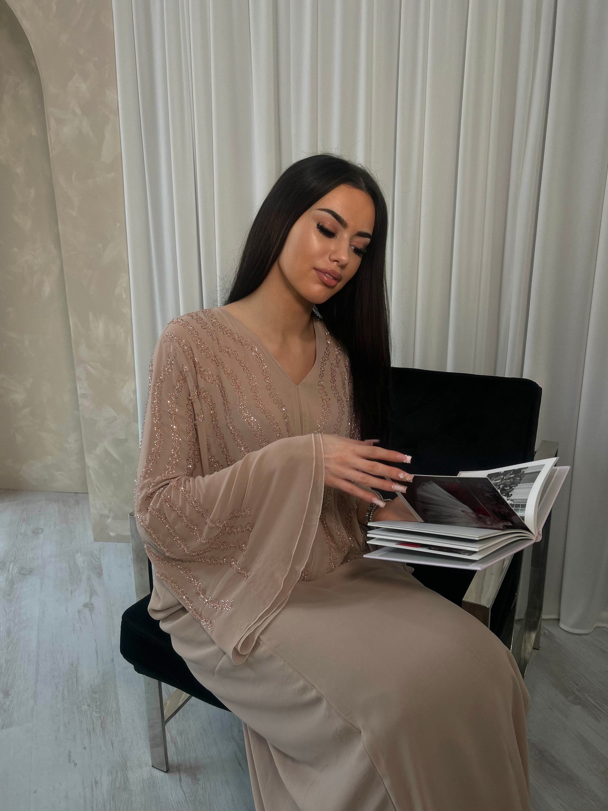 Elevate your wardrobe with this stunning Layali chiffon abaya in Dusty Pink, a perfect blend of elegance and modern design. The abaya features a lightweight, flowy chiffon overlay that drapes gracefully, making it ideal for both casual outings and special occasions. The abaya is andorned with handsewn bead design, adding a sophisticated texture that enhances the overall look.